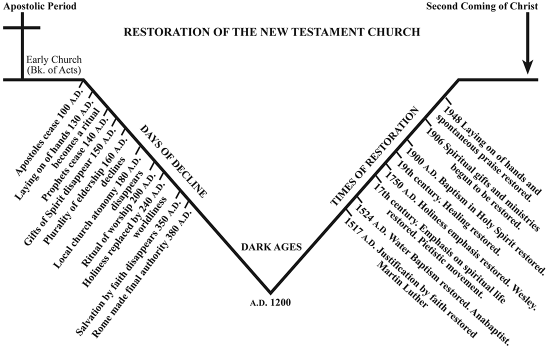 "These are days of restoration," declares Blomgren. "It is exciting to know that the true church will indeed be triumphant, restored by God to strength in this last day." (p. 16) Charismatic Restorationists believe that we are living in the era that will witness these things. Many Restorationists believe that these events will be facilitated by an outpouring of the Holy Spirit often called the "latter rain" revival. The chart in this article is taken from Blomgren’s booklet (p. 9) and depicts their understanding of the history of the decline and restoration of the church. I would take strong exception to most, if not all, of his points.